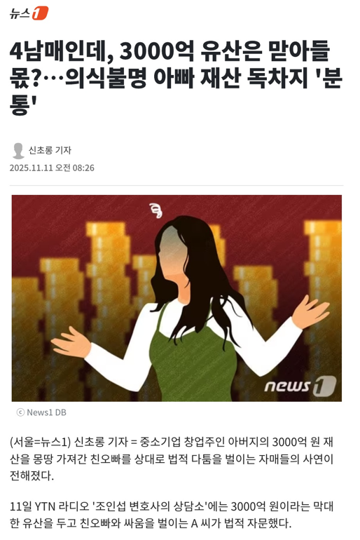 11일 YTN 라디오 '조인섭 변호사의 상담소'에는 3000억 원이라는 막대한 유산을 두고 친오빠와 싸움을 벌이는 A 씨가 법적 자문했다.