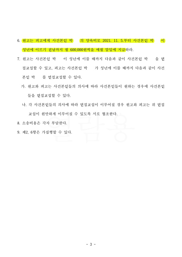 - 의뢰인이 양육하는 자녀가 성인이 된 이후, 상대방에게 양육비 월 60만원 지급​
