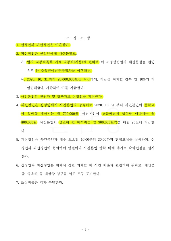 2. 차량 지분 이전 및 2천만원 지급 (상대방의 채무를 제외하고 50%의 재산분할을 인정받음