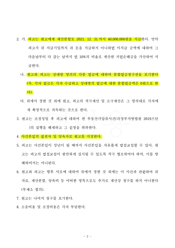 - 재산분할로 피고는 의뢰인에게 4천만원 지급